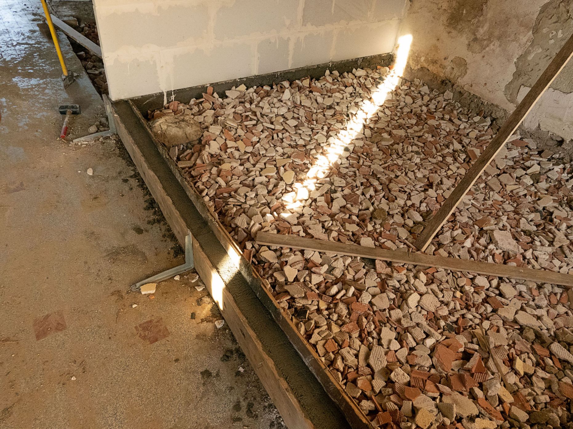 Et enlever la terre pour retrouver le rocher. On coulera une dalle sur la pierre et des gravats concassés.