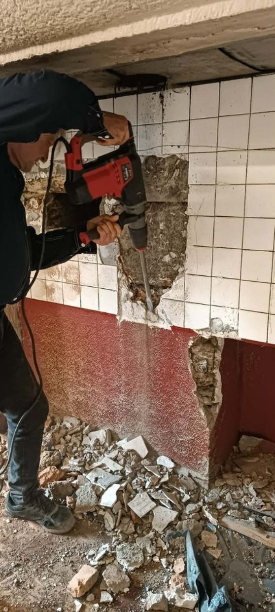 Travail pénible de pilonage de pierre et béton avec un marteau perforateur de 10 joules pesant 7,5 kg