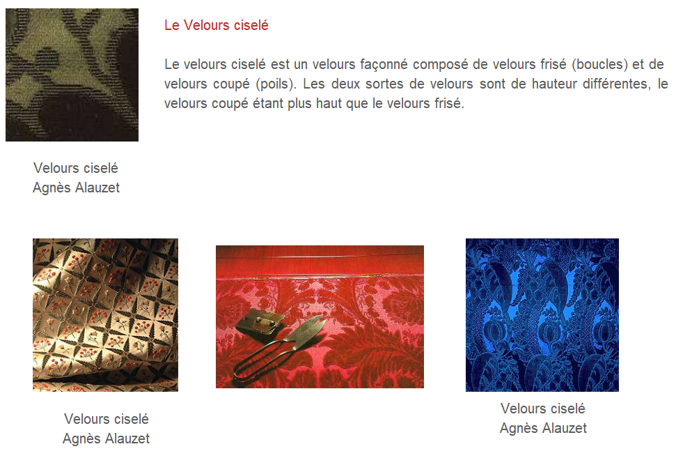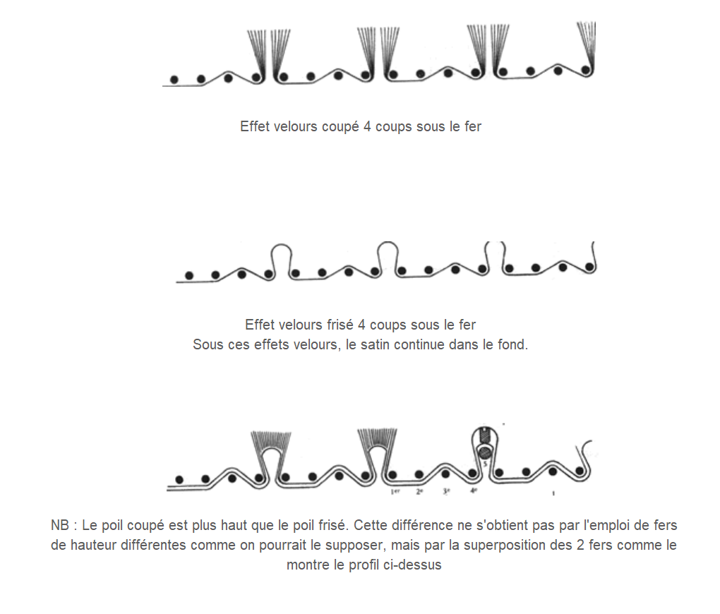 Velours ciselé un corps monté tout à la corde et sur tringles.Proportion de 8 fils pièces pour 1 fil poilFond satin de 8 par la chaîne pièce et 1 trame soie (1 lat = 1 seule navette)