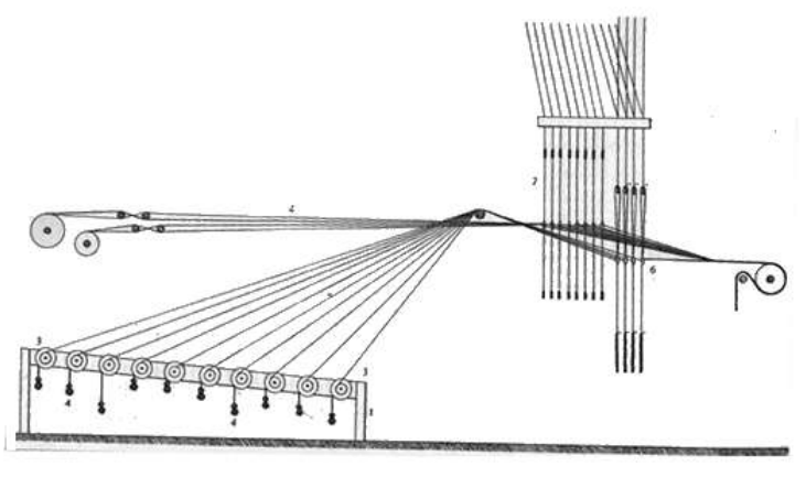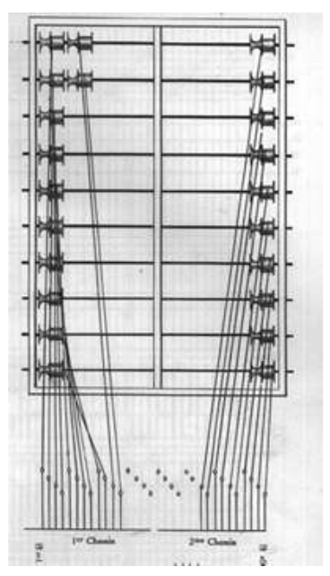 La chaîne pièce est remise sur 8 lisses (cadres) placées derrière le corps de maillons du poil (coté arrière du métier).