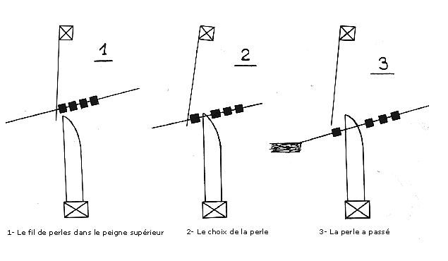 Quand le pas se referme, le battant remonte; la perle se pose dans la partie inférieure du peigne et se trouve poussée sur la dernière trame lancée.