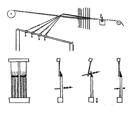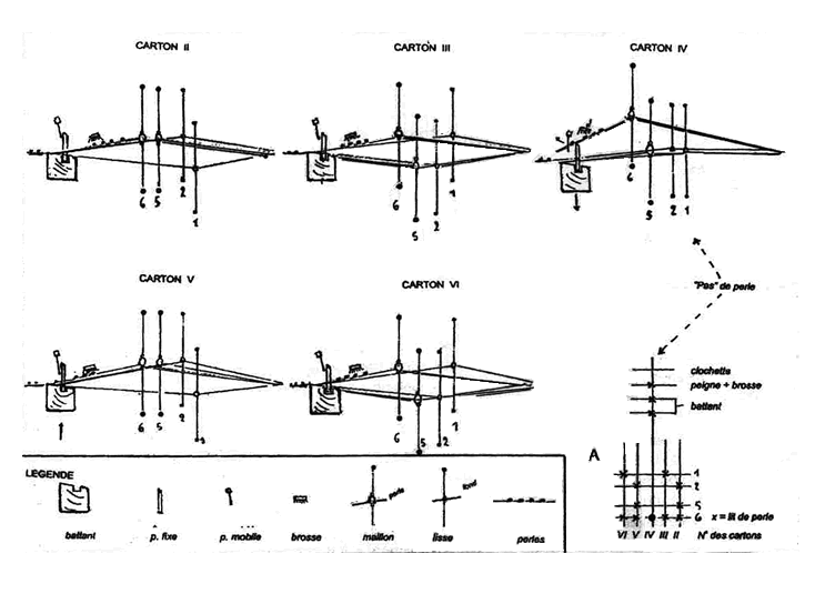 4- Du système de leviers, pour faire descendre le battant, qui est commandé par deux collets de la mécanique. Le tissage se fait comme indiqué dans les schémas de la fig.