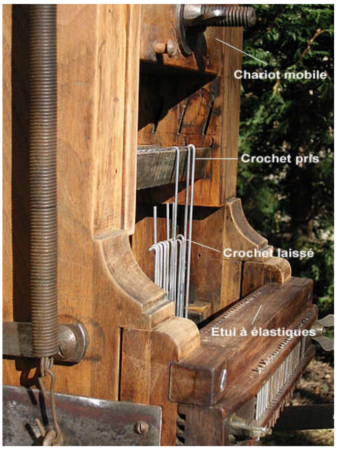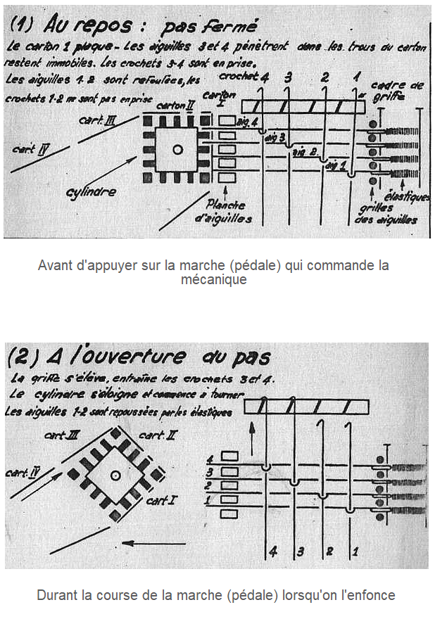 Comme un carton viendra se positionner entre une face du cylindre et l'extrémité des aiguilles, les aiguilles seront repoussés là où il n'y a pas de trou sur le carton, et au contraire resteront immobiles là où il y a un trou dans le carton.