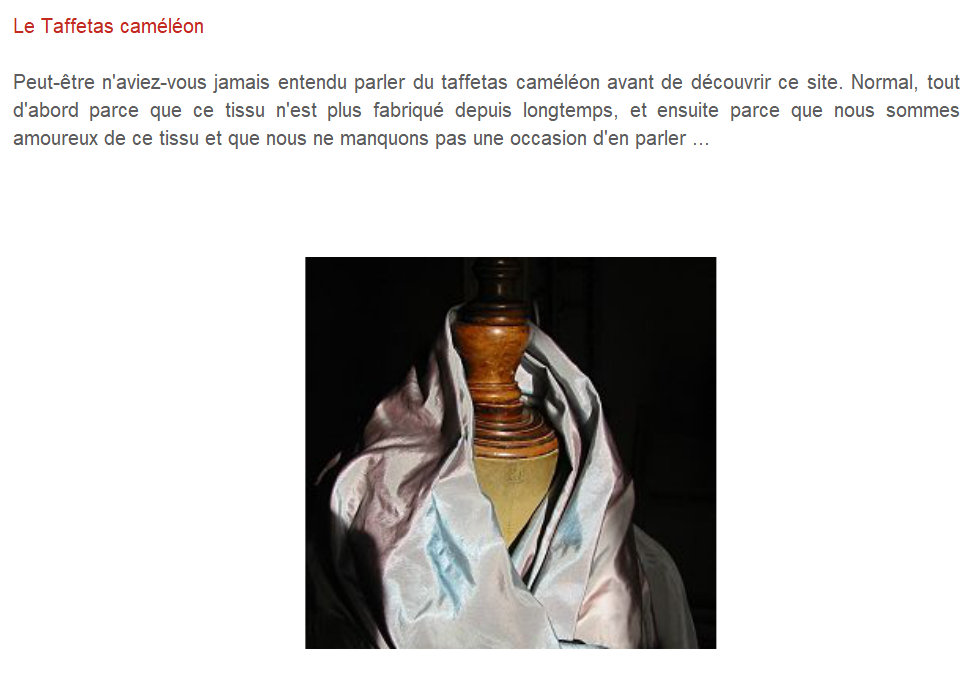 2- Les taffetas dits "caméléon" : l'aspect changeant est encore plus fort, il est composé non pas de deux couleurs, mais de trois.C'est là que la polémique peut s'établir. Car les taffetas caméléons ont d'abord été tissés à la main.
