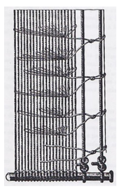 Ici nous voyons à droite le motif composé de 15 fils et à gauche nous voyons les 15 cordes de semple verticales nécessaires à commander ces 15 fils du motif.