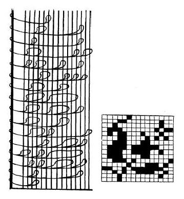 Ici nous voyons à droite le motif composé de 15 fils et à gauche nous voyons les 15 cordes de semple verticales nécessaires à commander ces 15 fils du motif.