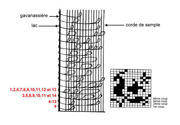 Il emprisonne les cordes de semple 4 et 13, et nous vérifions en effet sur le deuxième coup de navette que ce sont bien les fils 4 et 13 qui lèvent, puis 3, 5, 8, 9, 10, 11 et 14 sur le troisième coup, 1, 2, 5, 7, 8, 9, 10, 11, 12 et 13 sur le quatrième coup, et ainsi de suite.