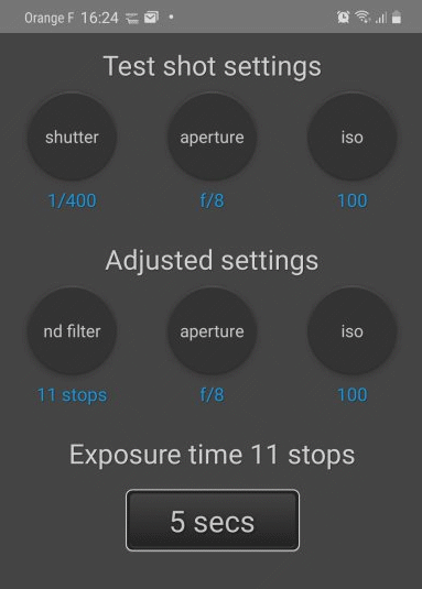 L'utilisation est enfantine. Il suffit d'indiquer sur la ligne du haut la vitesse (shutter), l'ouverture (aperture), les ISO correspondant à une bonne exposition sur votre appareil avant de mettre le filtre en place, puis le type de filtre gris neutre utilisé sur la ligne du bas, pour que s'affiche le temps de pose que vous devez utiliser avec le filtre en place.