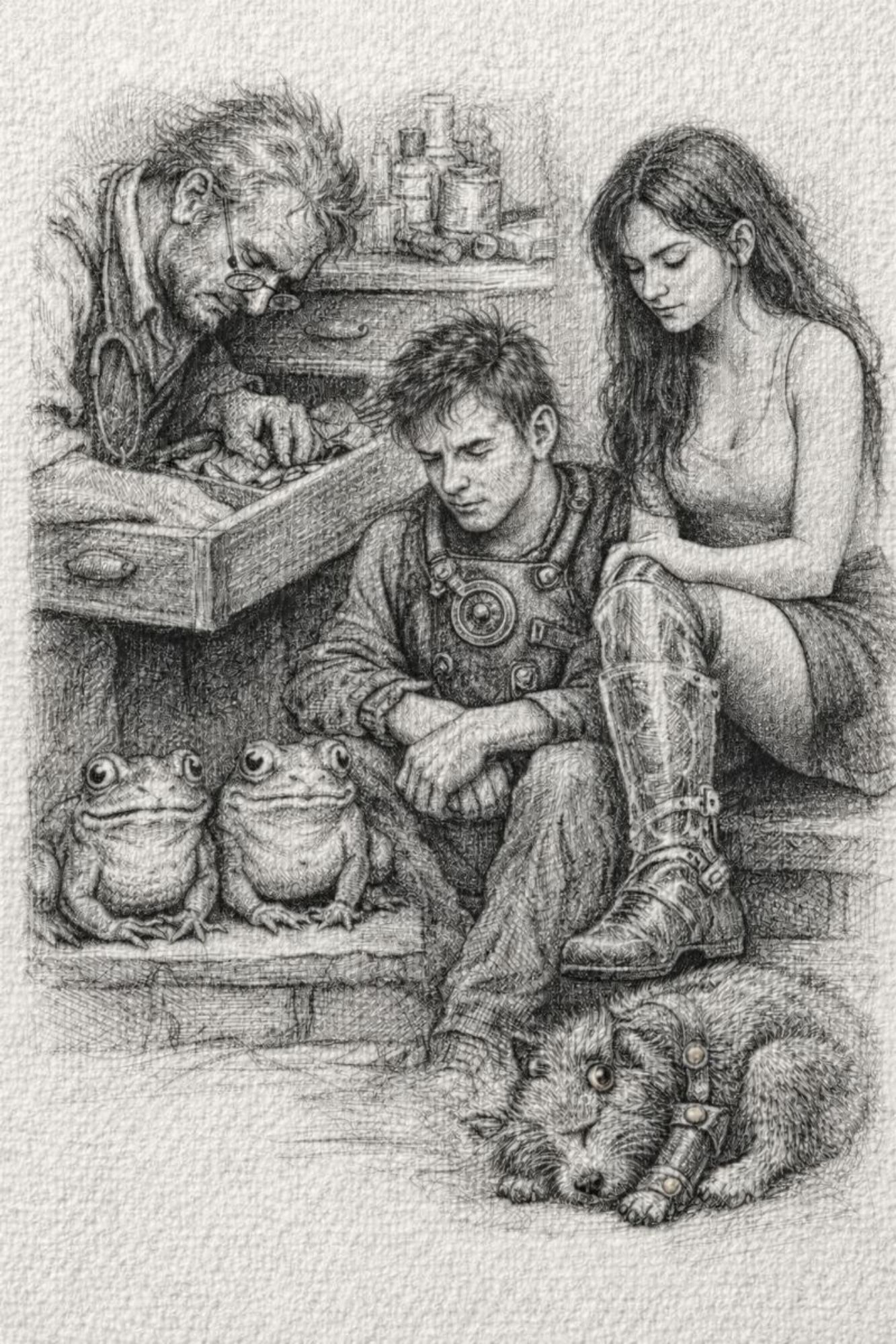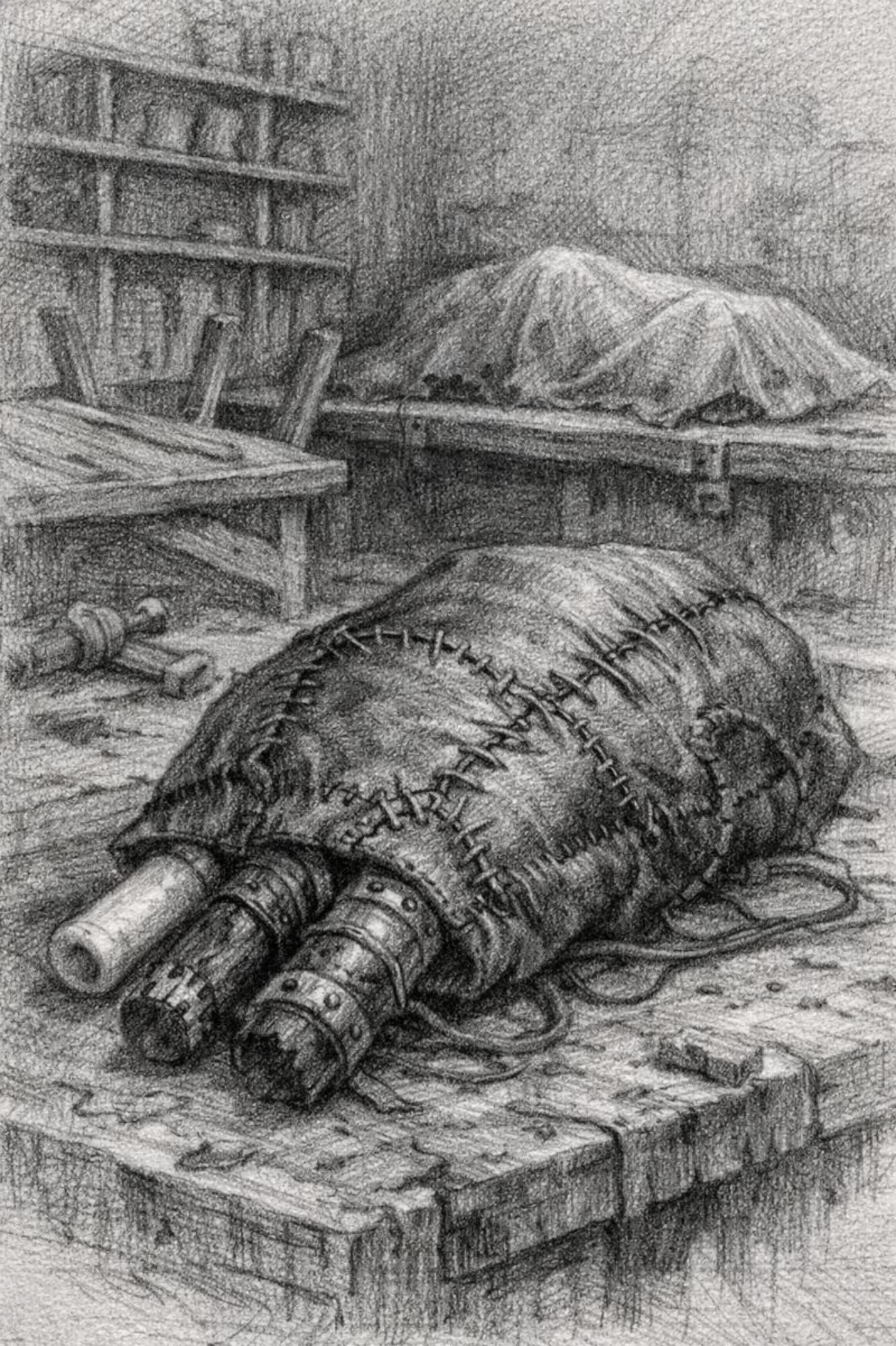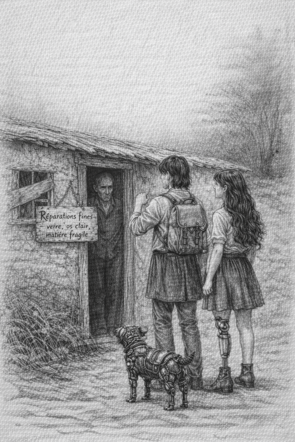 Une poche de cuir vivant, cousue de réparations anciennes. Des tuyaux de matières différentes, os, zinc, bois, verre opaque. Certaines parties vibrent même sans air. Quand il joue un souvenir remonte, une douleur devient audible, un choix devient inévitable. Il ne répare jamais, il rend vrai. C'est un compagnon silencieux, parfois encombrant, parfois dangereux, parfois apaisant.