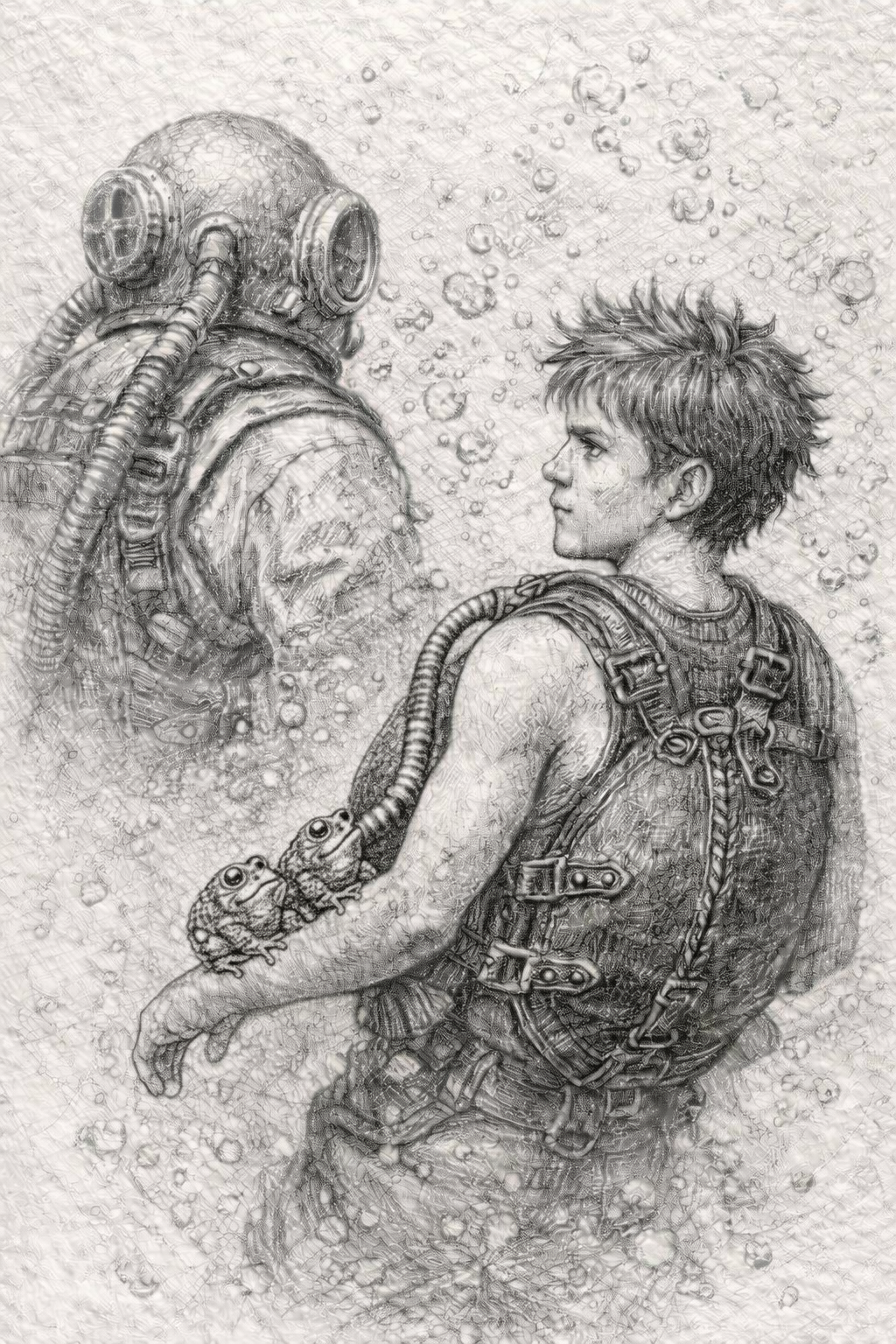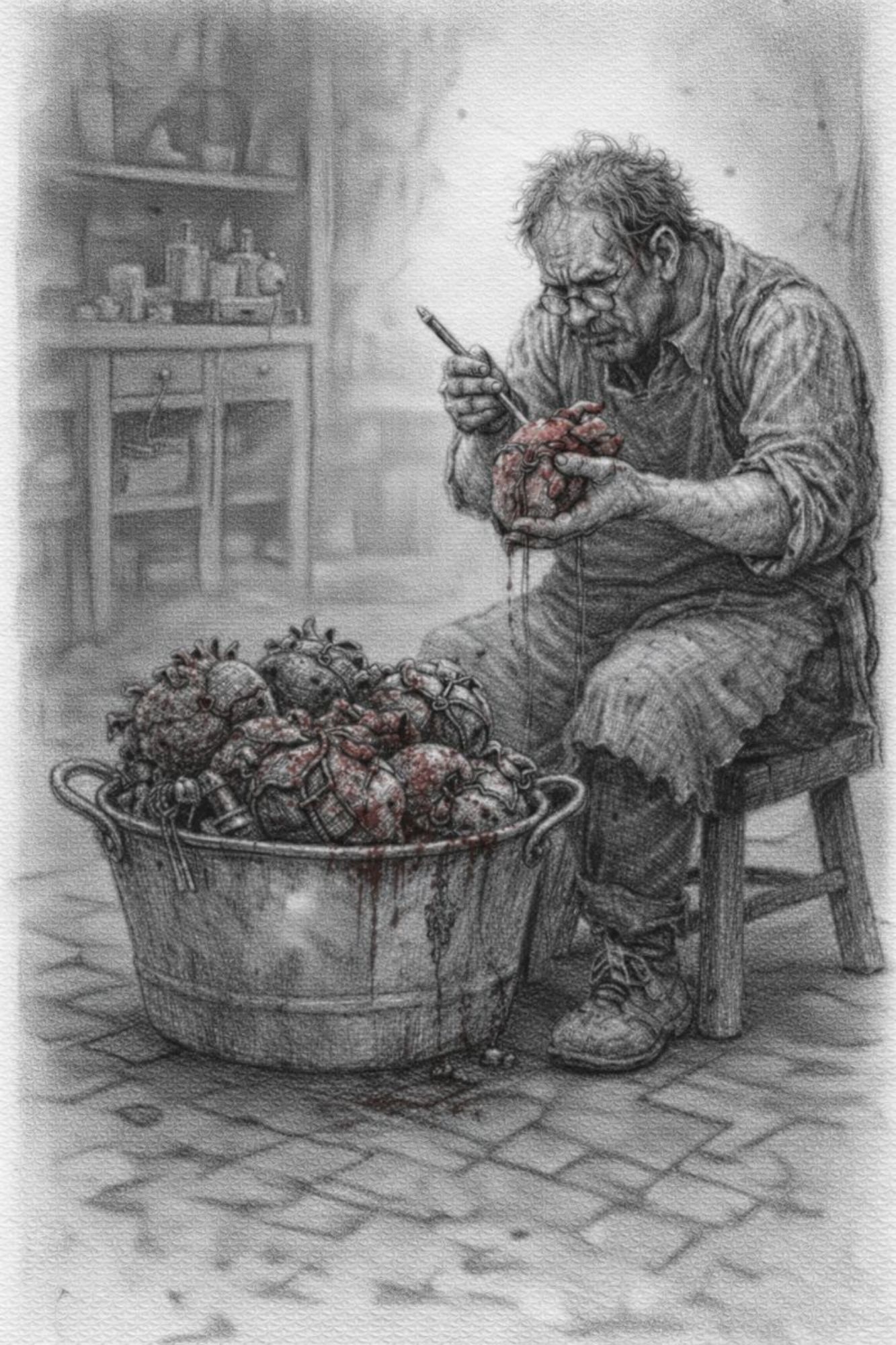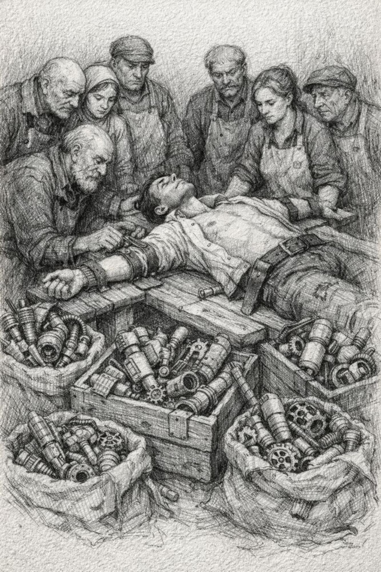 Une poche de cuir vivant, cousue de réparations anciennes. Des tuyaux de matières différentes, os, zinc, bois, verre opaque. Certaines parties vibrent même sans air. Quand il joue un souvenir remonte, une douleur devient audible, un choix devient inévitable. Il ne répare jamais, il rend vrai. C'est un compagnon silencieux, parfois encombrant, parfois dangereux, parfois apaisant.