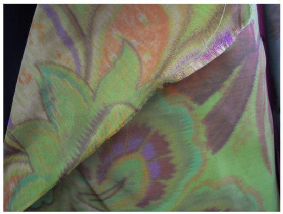 La digitalisation de cet échantillon est mauvaise, mais le flou significatif des contours de motifs est assez bien rendu. Le dessin semble flou, et en même temps cisaillé comme si la teinture avait bavé...