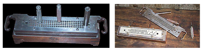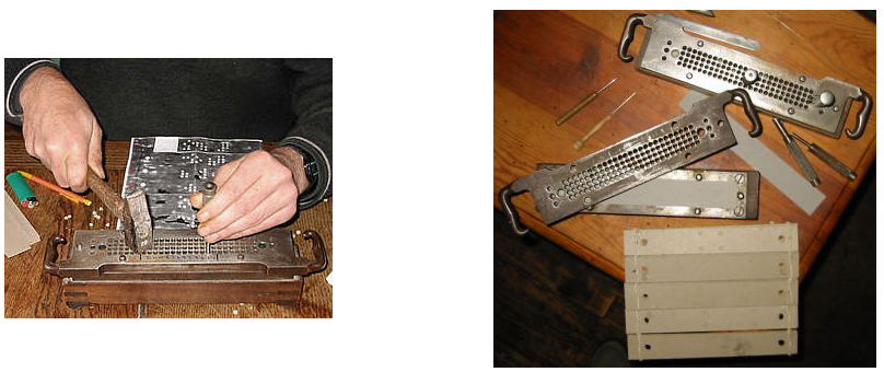 Le carton est serré entre les 2 plaques et les trous sont percés à l'aide d'emporte pièces. En utilisant des plaques matrices le percage se fait avec un maillet.
