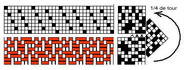 Dans ces croquis, nous trouvons les 4 armures :De haut en bas, le taffetas, le fantaisie 1, le fantaisie 2, et le satin.