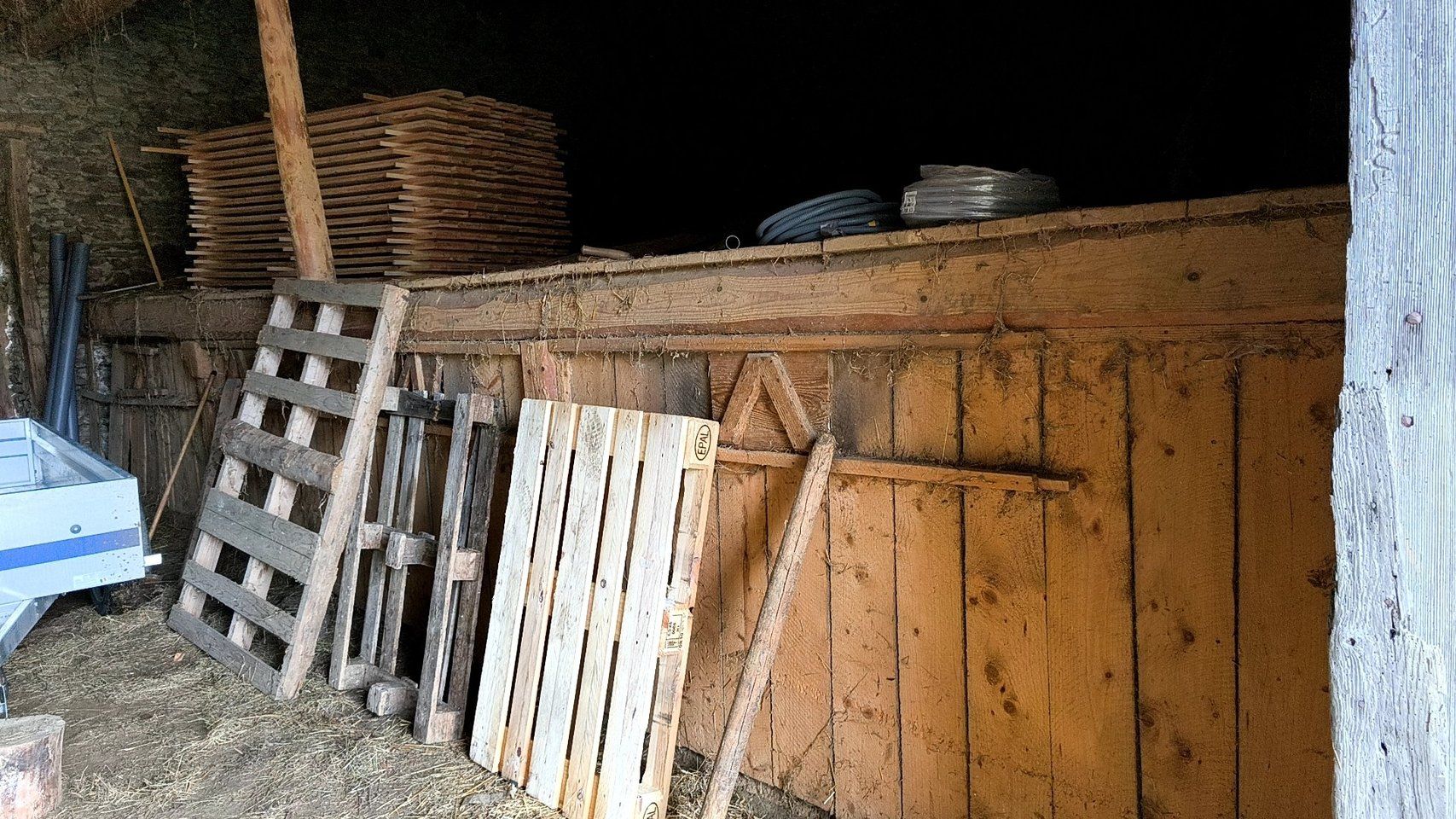 266 planches de Douglas de la région, de 2m40 par 13 cm sècheront tout l'hiver avant de constituer les cloisons doubles de l'habitation. Les câbles électriques prendront place entre elles et seront donc invisibles. Les planches sont stockées bien à plat, séparées par des tasseaux pour que l'air circule facilement, aidant ainsi au séchage.