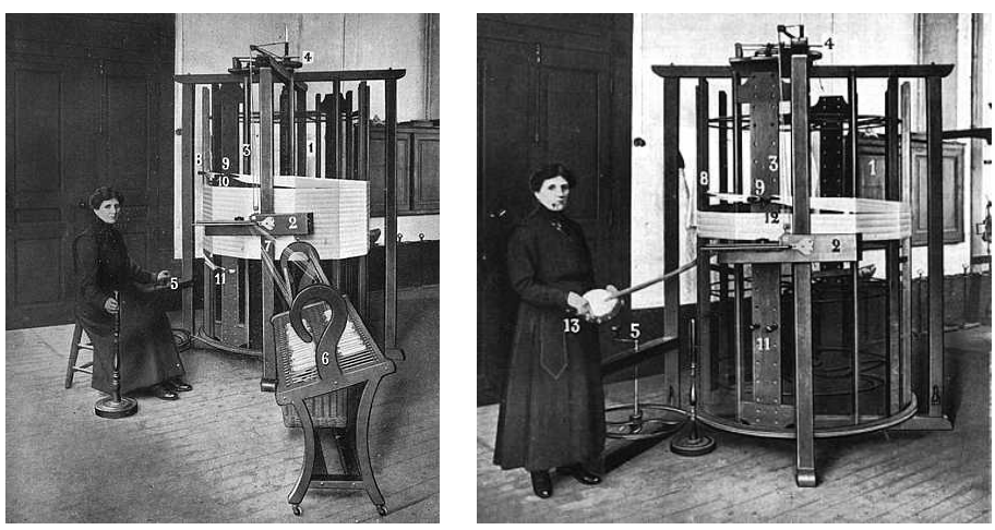 Elle enroule d'abord la première musette (40 fils) de haut en bas sur le tambour, puis elle juxtapose une seconde musette en remontant de bas en haut et continue ainsi jusqu'à ce que le nombre voulu de musettes ou de portées ait été mis sur l'ourdissoir.