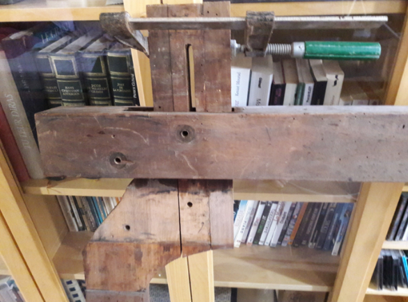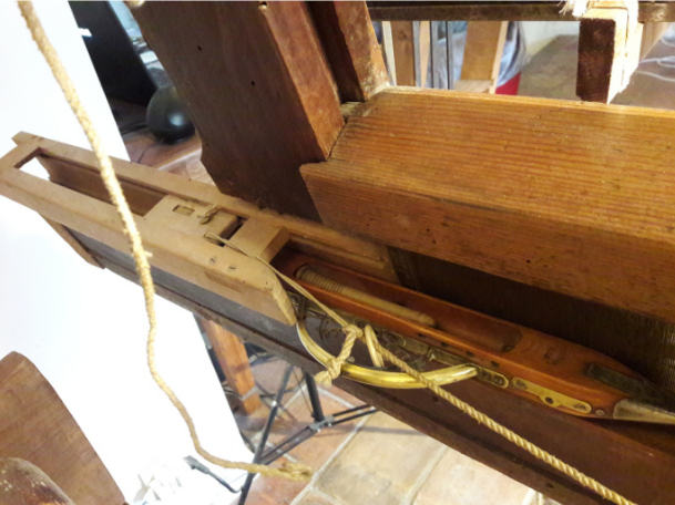 supporter le levier de bois. Ce dernier est fixe, vissé sur le pied du métier, tandis que son autre extrémité reçoit les poids
