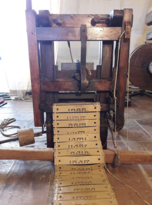 sur ce métier parce que c'est la mécanique Jacquard, grâce à ses cartons, qui va s'occuper de sélectionner les cadres à soulever.