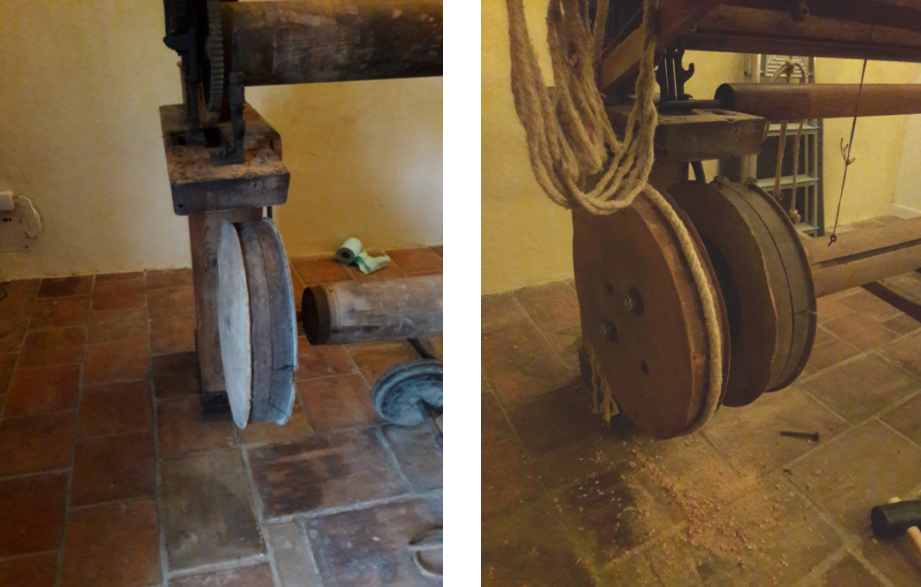 sur la poulie qu'est en réalité le savoyard. La corde monte ensuite à la verticale jusqu'en haut du bâti.