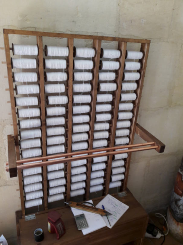 donc 80 bobines sur la cantre (chez les canuts on dit une cantre).Il faut encore poncer leur extrémité et roder les trous.