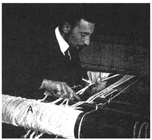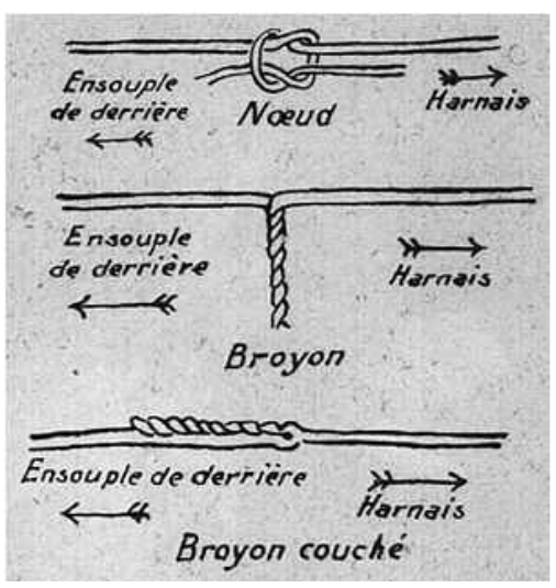 Pour le tordage, on roule les deux extrémités de fil entre les doigts, enduits d'un peu de blanc d'Espagne, de lait, d'eau, de gomme ou de sucre, cendre, etc. Nous utilisons personnellement du blanc de Troyes (craie pilée mélangée à de la vaseline). Ce tordage est fait de telle sorte que le tors ou broyon (partie tordue) retombe du coté du rouleau arrière (ensouple), sans quoi il serait impossible de le faire passer dans le maillon puis dans la broche (dent) du peigne sans le "détordre". La tordeuse attachera à sa ceinture à l'aide d'une codelette les paquets de fils deux par deux (afin que les deux mèches soient tendues), l'un venant du rouleau arrière et l'autre du remisse de cadres. Elle prendra les fils tels qu'ils se présentent de part et d'autre sur les cannes (baguettes) d'envergure et les réunira par des tors. Pour que ses doigts ne glissent pas, elle les plonge dans le blanc de Troyes (pouce, index et majeur).