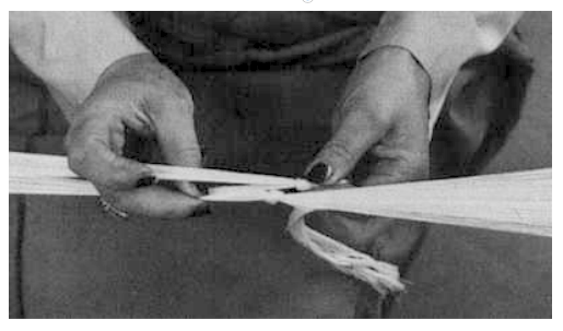 A l'aide d'une cordelette, elle réunit les deux paquets de fils ensemble.