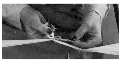 Avec le pouce et l'index de la main gauche, les deux fils sont rapprochéspuis pincés,
