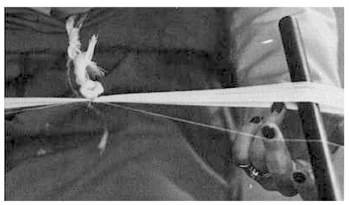 L'autre extrémité de la cordelette est nouée à la taille de manière à être trés tendue.