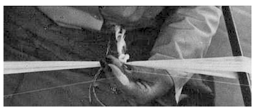 tandis que le majeur rompt par en dessous les deux fils auniveau du noeud de la cordelette.