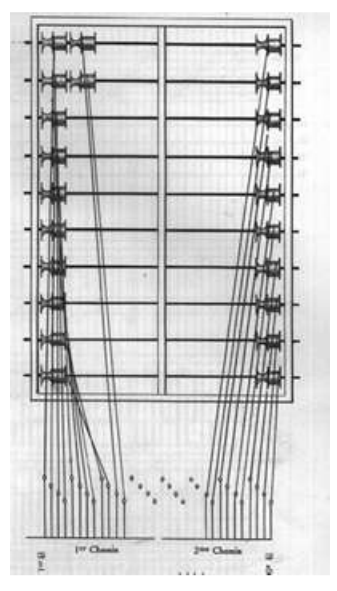 La chaîne pièce est remise sur 8 lisses (cadres) placées derrière le corps de maillons du poil (coté arrière du métier).