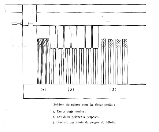 Le matériel qui a pu permettre la fabrication des tissus perlés consiste en un peigne, ou plus exactement en un double peigne monté sur un battant de métier à bras.