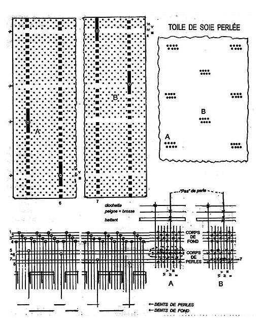 Le tissage d'une étoffe perlée est normalement celui du tissu de base avec en plus, tous les quatre à six coups, le coup pour faire passer les perles de la décoration.