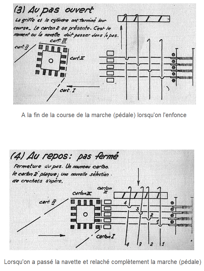 Chacun des cartons indique les crochets et fils qui doivent être levés ou non pour un coup de trame.