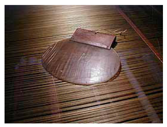 Nous avons dit que les deux trames qu'on emploie sont de grosseurs inégales; elles sont montées sur deux navettes particulières que l'on fait passer alternativement dans l'ouverture, de manière que la chaîne simple recouvre la trame fine, et la chaîne double ou triple, la trame à plusieurs brins.