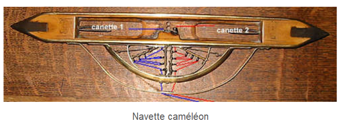Dans le taffetas caméléon tissé à bras, le vrai, on utilise une chaîne d'une seule couleur et on emploie une navette spéciale, dite "navette caméléon" qui comporte deux canettes de couleurs différentes, dont le déroulement est freiné individuellement sur chacune des deux trames. En effet il faut impérativement que les deux fils soient déposés tendus dans la foule sans jamais se toucher, de manière à être rigoureusement paralèlles une fois tassés.