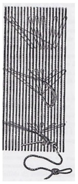Abandonnant les cordes du semple, elle formait alord autant de boucles qu'il y avait de prises, la main droite les séparant exactement et accrochant entre chacune d'elles, le fil à sa main gauche, de façon à laisser entre les cordes et la main, la longueur qui devait être donnée aux boucles du lacs.