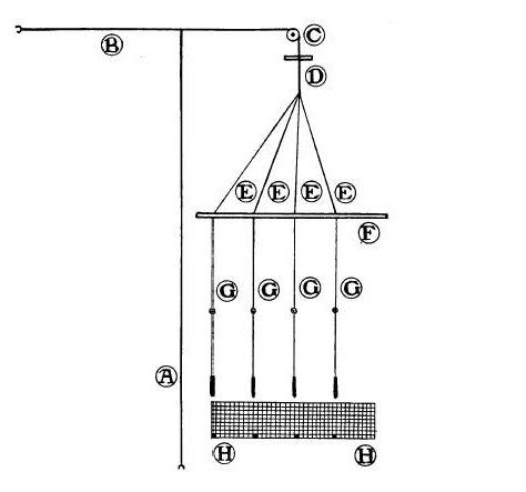 Ces 4 fils font donc exactement le même travail. Ils seront levés ensemble et donc les 4 mailles (lisses) correspondantes G sont attachées en D à la même corde de rame B qui passe sur une poulie C.