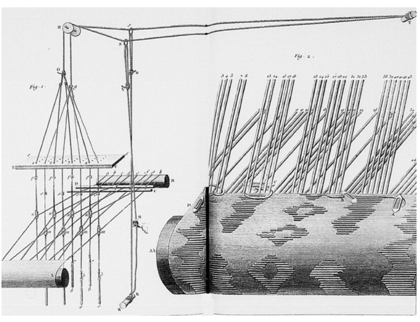 Avant l'invention de la mécanique Jacquard, au début du XIX° siècle, les tissus façonnés étaient réalisés sur des métiers à la tire.
