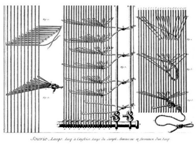 Soierie, développement des cordes de rame et de sample et leur action sur les fils de la chaîne des étoffes brochées ou le poil des velours frisés et coupés, planche n°62 du recueil factice des 127 planches relatives à la soierie et au tissage, encyclopédie, Diderot et d’Alembert, 18e s.