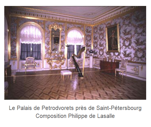 Ce dessin fut commandé au début des années 1770 pour participer à la décoration du salon du Palais Bourbon à Paris. Dix ans plus tard, au début des années 1780, il fut à nouveau utilisé dans le Grand Palais de Peterhof, dans la résidence de campagne de l'impératrice Russe Catherine II. Dans le Grand Palais de Peterhof, le tissu fut utilisé dans un boudoir décoré en suite, ce qui signifie que le même tissu recouvrait les murs, les sièges et les tentures. Ce dessin fut célèbre et répandu en différents coloris. Le travail de Philippe de Lasalle attira l'attention de la Grande Catherine par l'intermédiaire du philosophe Voltaire. Philippe de Lasalle travaillera pour nombre des Grands de ce monde...