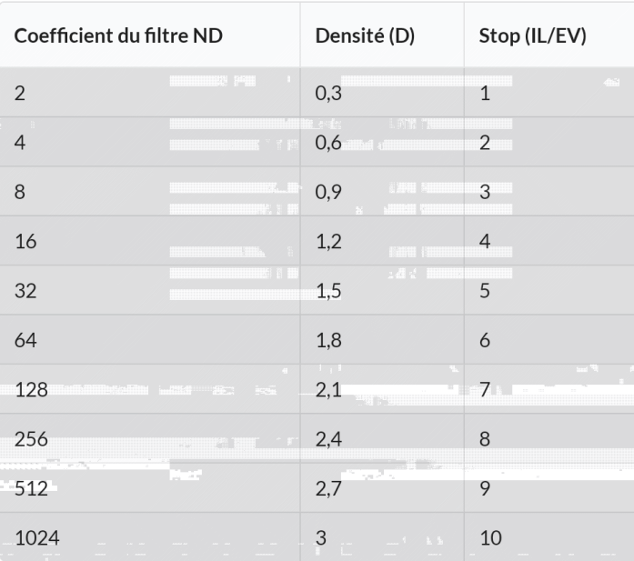Le tableau ci-dessus présente les correspondances entre la densité optique du filtre (D), le coefficient (ND) et la vitesse à ajuster (IL ou stops). Par exemple, avec un filtre ND 64, vous perdez 6 stops (IL). Pour compenser cette perte de lumière, vous allez devoir baisser de 6 crans votre vitesse.