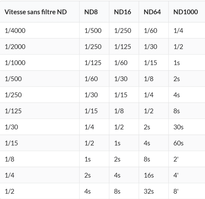 Le tableau ci-dessus présente pour quatre filtres différents (ND8, ND16, ND64 et ND1000), la perte de stops (IL) et la correspondance en termes de vitesse. Par exemple, en pleine journée vous avez une vitesse de 1/500. Avec un filtre ND16, vous obtiendrez une vitesse de 1/30 qui ne vous permet pas une pose longue. En utilisant un filtre ND1000 vous obtenez une pose de 2 secondes.