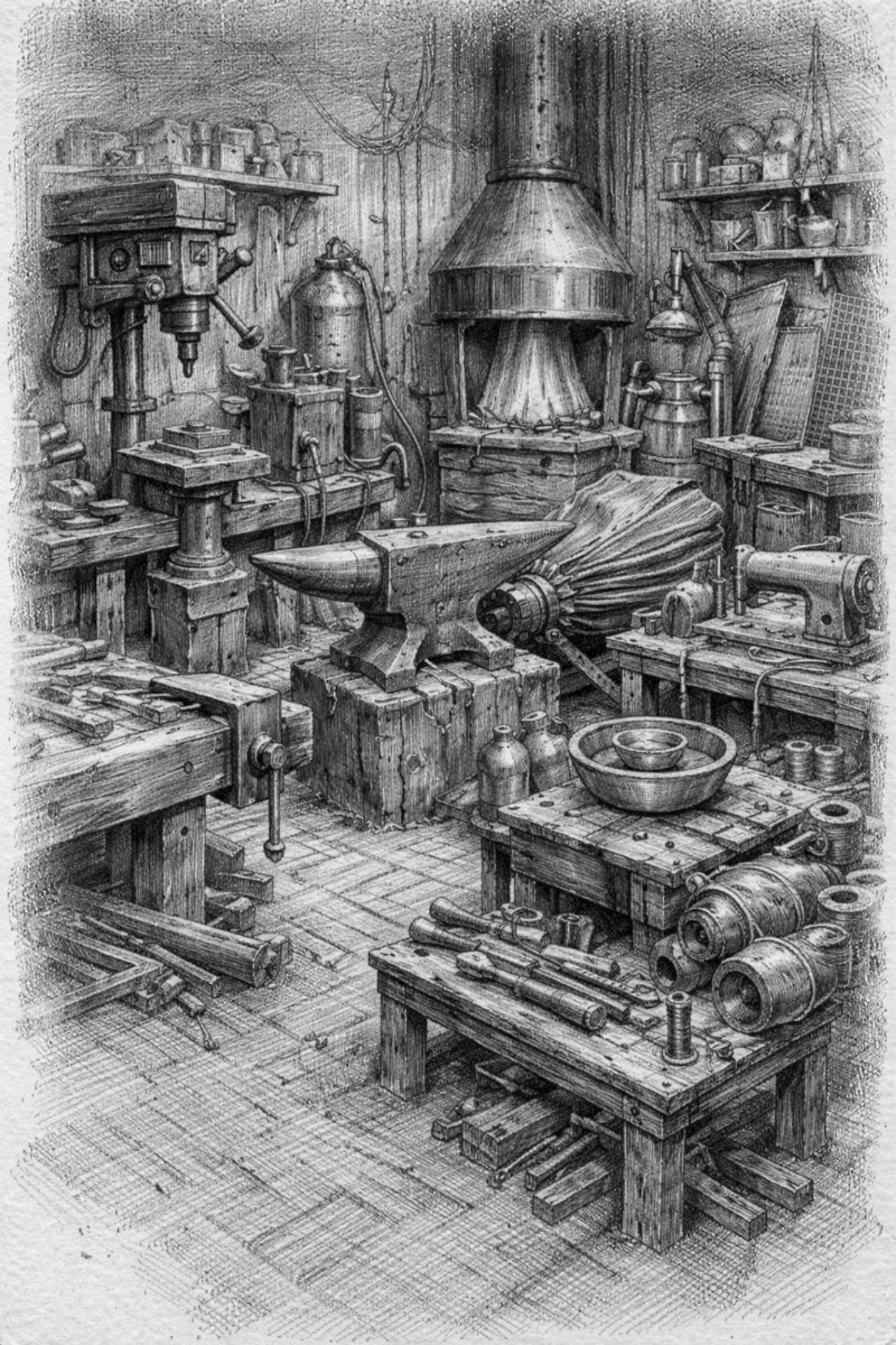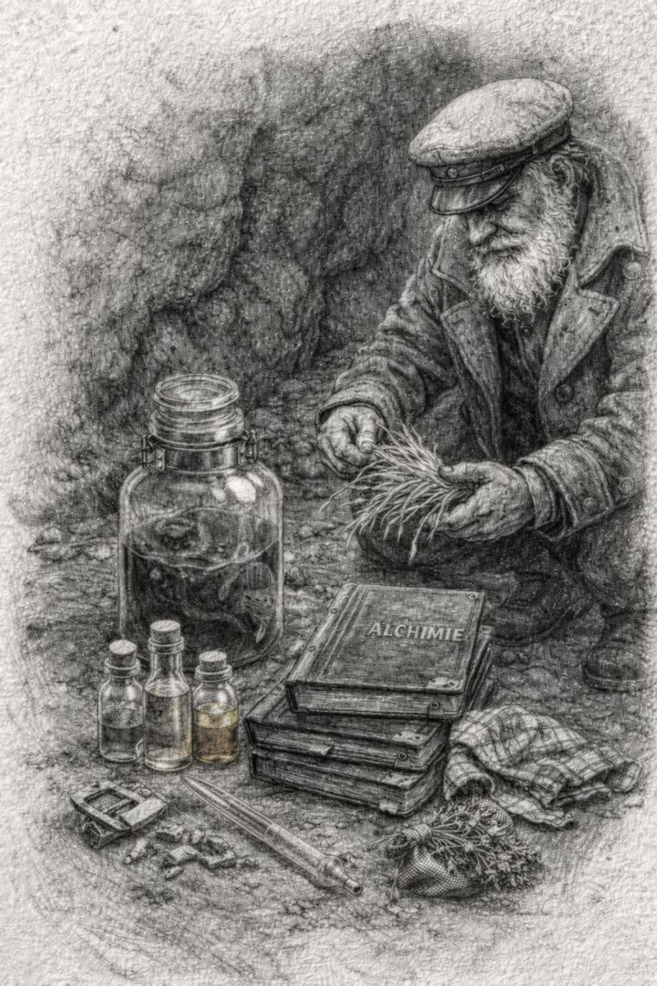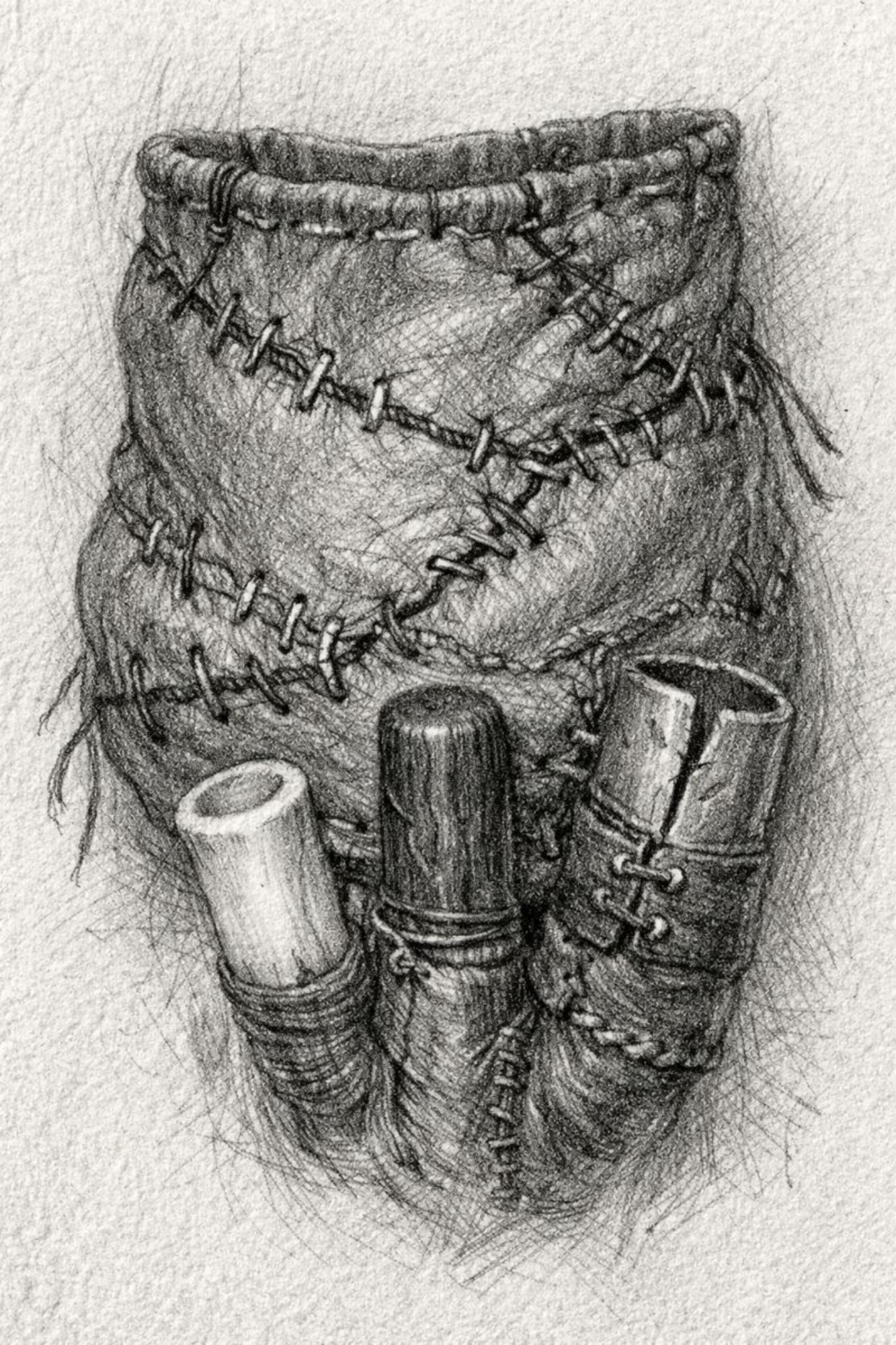 Une poche de cuir vivant, cousue de réparations anciennes. Des tuyaux de matières différentes, os, zinc, bois, verre opaque. Certaines parties vibrent même sans air. Quand il joue un souvenir remonte, une douleur devient audible, un choix devient inévitable. Il ne répare jamais, il rend vrai. C'est un compagnon silencieux, parfois encombrant, parfois dangereux, parfois apaisant.