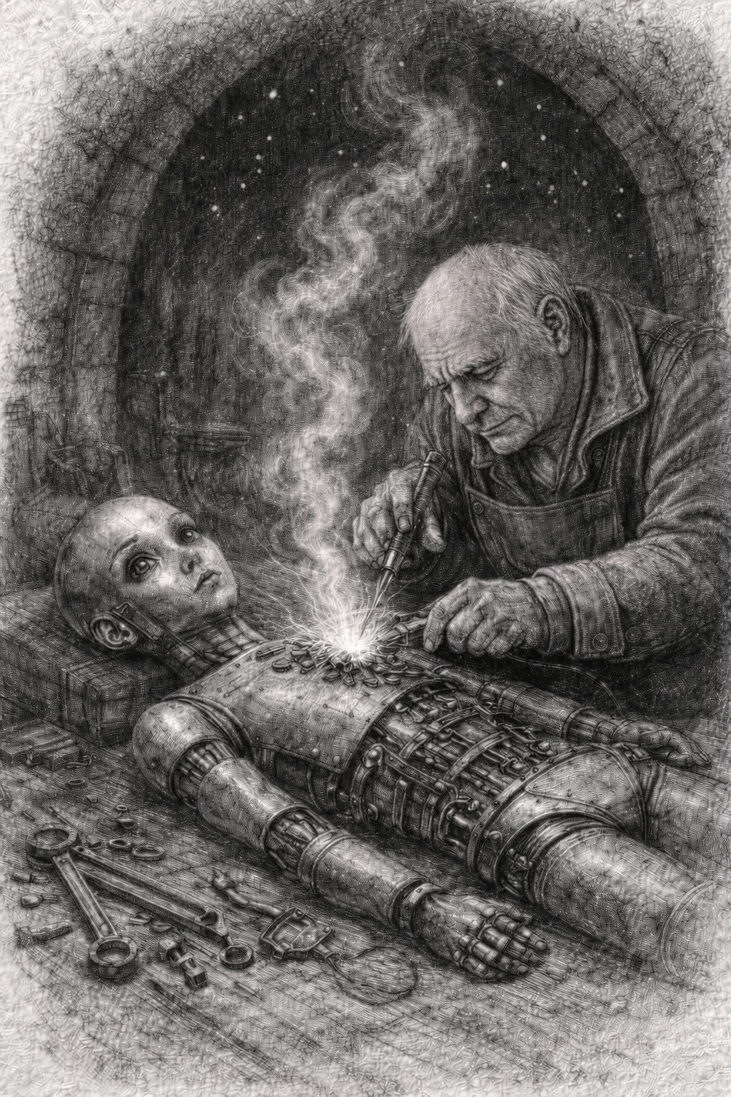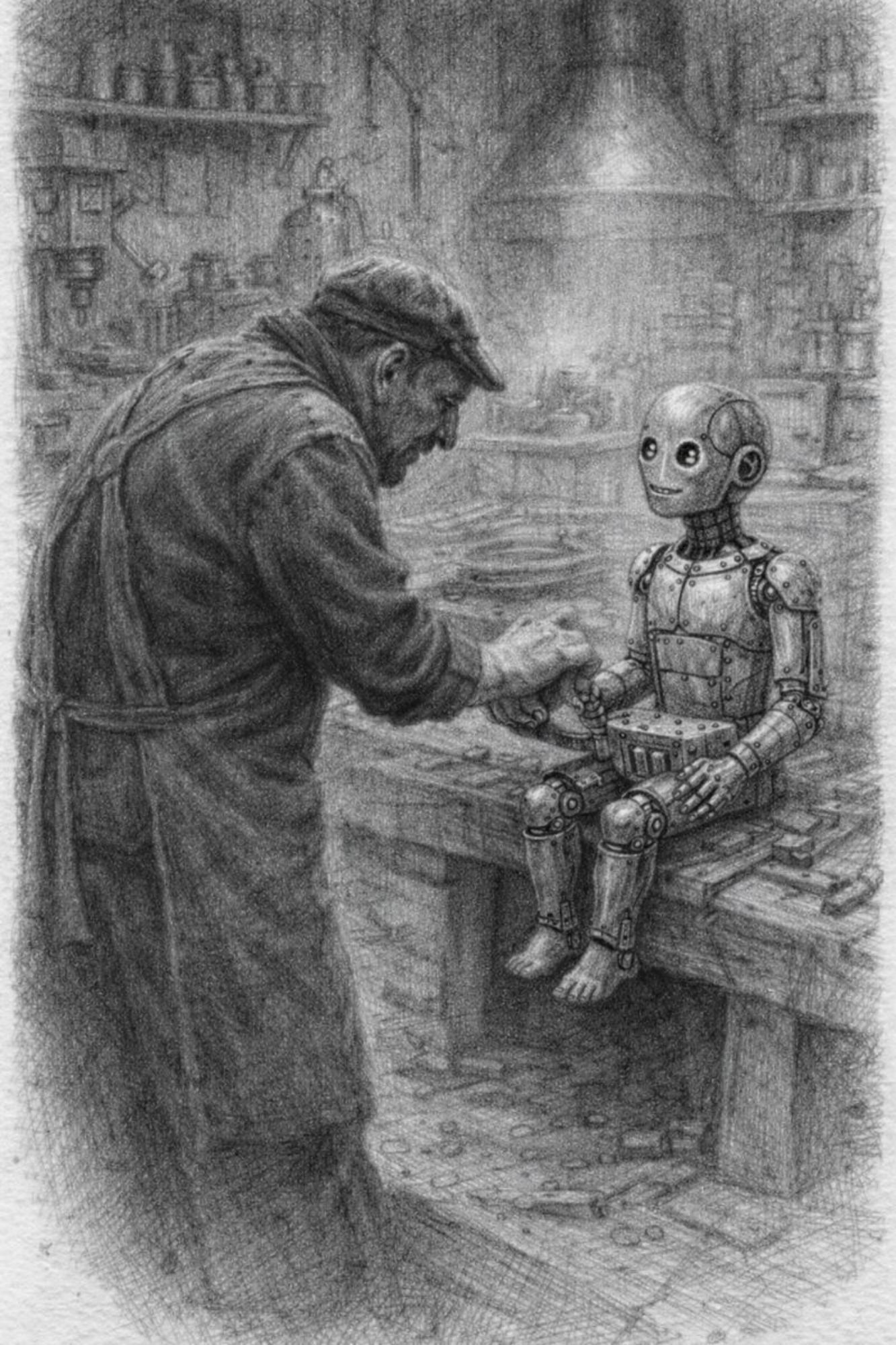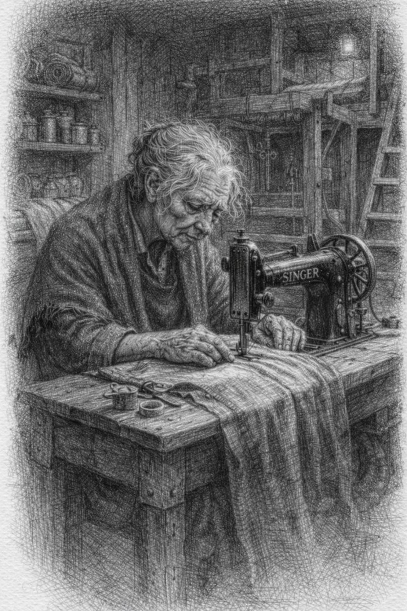 Une poche de cuir vivant, cousue de réparations anciennes. Des tuyaux de matières différentes, os, zinc, bois, verre opaque. Certaines parties vibrent même sans air. Quand il joue un souvenir remonte, une douleur devient audible, un choix devient inévitable. Il ne répare jamais, il rend vrai. C'est un compagnon silencieux, parfois encombrant, parfois dangereux, parfois apaisant.