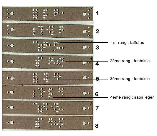 Armure 1 : taffetas, rapport sur 2 coups (cartons 3,5,7 = 1, cartons 4,6,8 = 2)