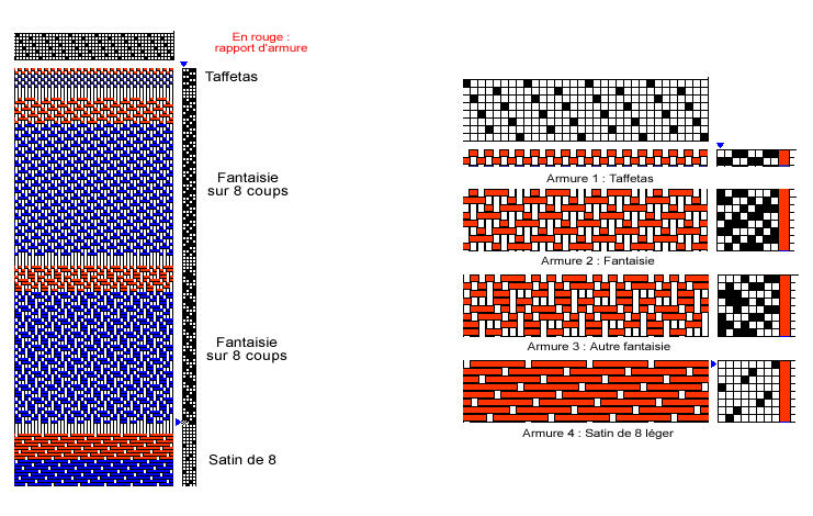 Dans ces croquis, nous trouvons les 4 armures :De haut en bas, le taffetas, le fantaisie 1, le fantaisie 2, et le satin.