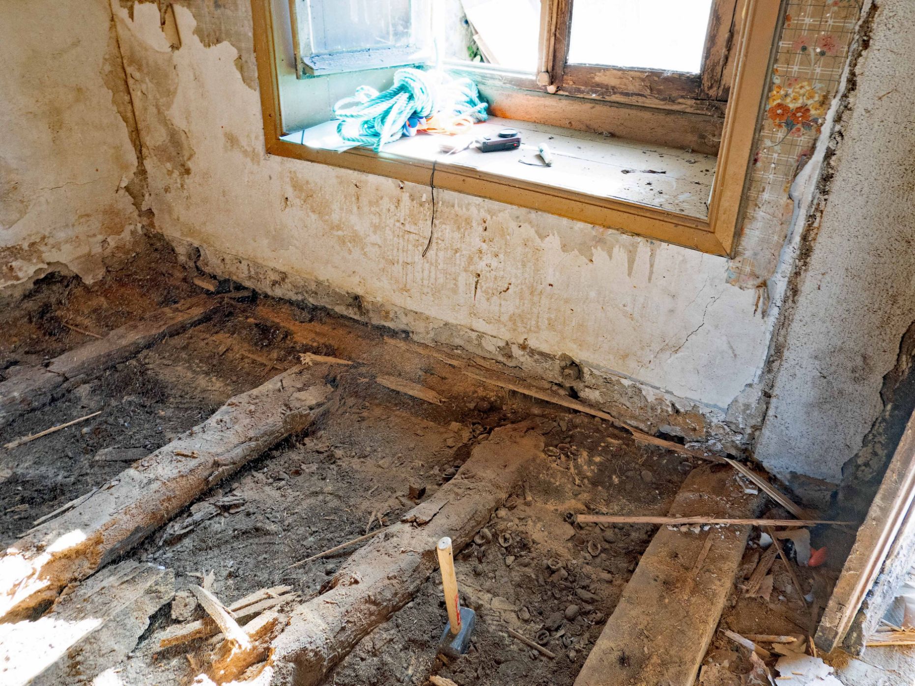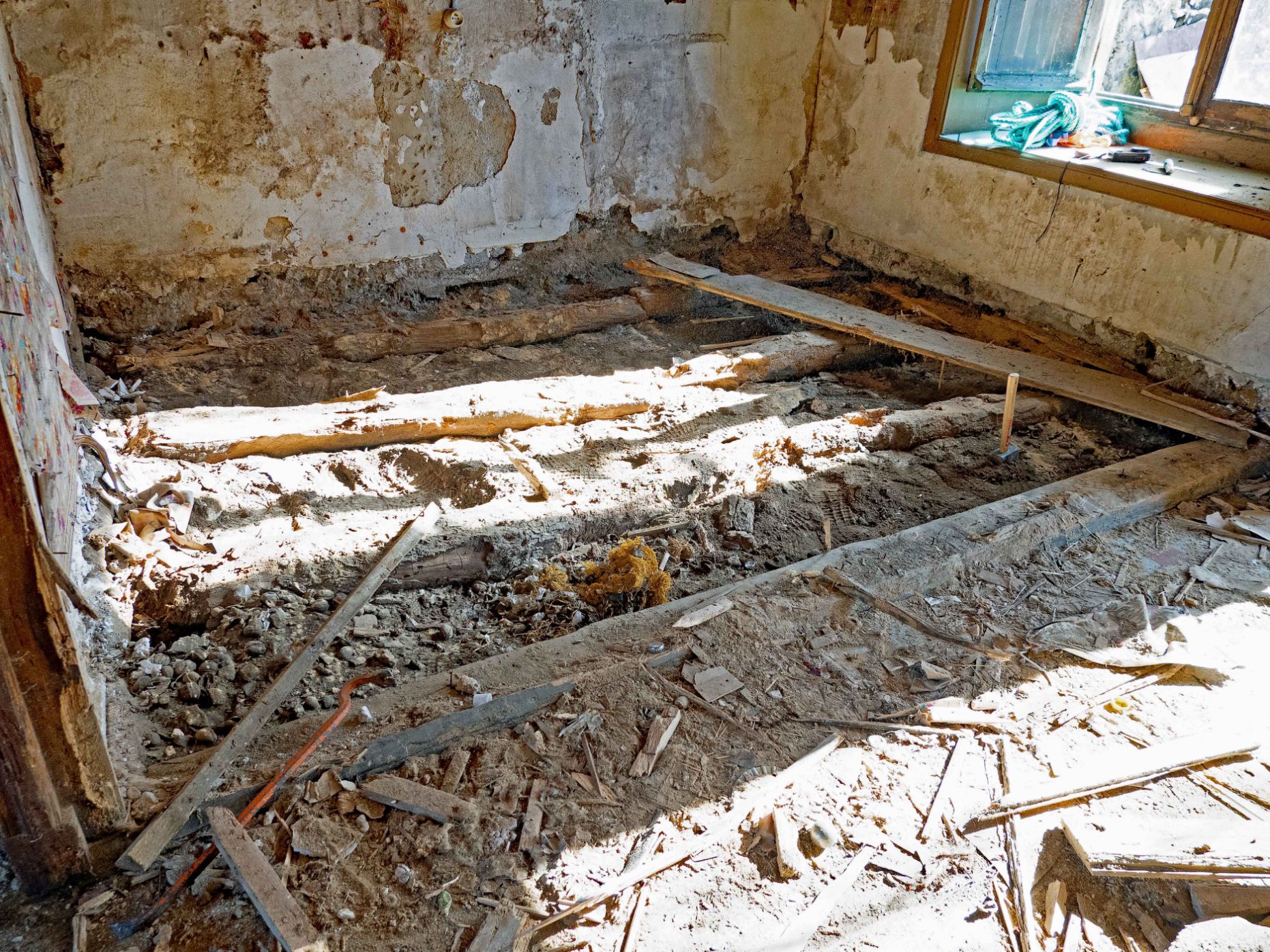 Un vieux plancher pourri fixé sur des vieilles poutres pourries posées à même la terre...