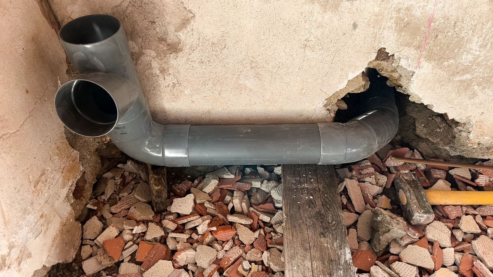 Préparation de l'évacuation des eaux sanitaires dans la buanderie avant de couler la dalle.