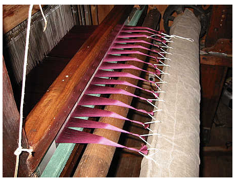 Le piquage terminé, il faut mettre en place le battant et le rouleau avant. Une fois le battant suspendu, on détache le peigne et on le met en place dans le battant. Puis on va défaire le noeud provisoire de chaque mèche de fils et le remplacer par 2 noeuds définitifs espacés de 2 cm de manière à ce que les noeuds de toutes les mèches soient au même niveau.