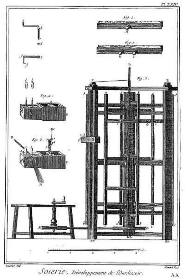 L'ourdissoir est accompagné d'un banc qui comporte une manivelle et une roue à courroie reliant la roue inférieure du tambour de l'ourdissoir en dessinant un huit. L'ourdisseuse assise sur ce banc maneuvre la manivelle pour faire tourner l'ourdissoir. L'ourdissoir est également accompagné d'une cantre qui reçoit les roquets de fil dévidés qui permettront de constituer la chaîne sur l'ourdissoir. Sur cette gravure, on voit une ourdisseuse assise sur son banc et maneuvrant l'ourdissoir, et l'on distingue les fils provenant de la cantre se réunir sur le plot de l'ourdissoir avant de s'enrouler sur le tambour de celui-ci.