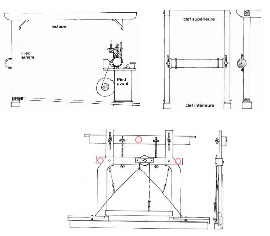 - Les deux longerons supérieurs au sommet du métier : les estases qui déterminent la longueur du métier
